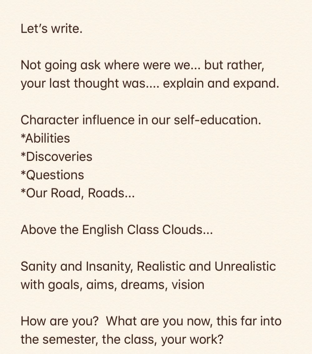 English 1A Posted by mikemadigan on November 6, 2019 11/5/19 Share this: Click to share on X (Opens in new window) X Click to share on Facebook (Opens in new window) Facebook Like Loading...