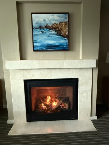 The fireplace relaxes me. Need to write with the little time before me. Sun breaking though fog, low clouds. News on but low volume.