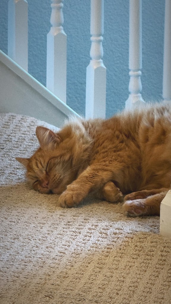 I refuse to be distracted, but then I am. Our cat, Portobello, or Portugal/Porty-B/Portlandia/Port Bolivia, and half a hundred other names, comes up to the loft, then falls asleep at the top stair.